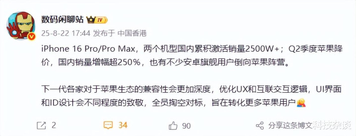 这不在8月22日行业人士“数码闲聊站”就提供了iPhone 16 Pro、iPhone 16 Pro Max在国内的激活量数据。他表示iPhone 16 Pro系列这两款机型目前在国内激活量已经突破2500万台,第二季度苹果降价国内销量增长超过250%,其中有不少安卓旗舰用户转向了iPhone 16 Pro系列阵营。看到了吗?iPhone 16 Pro系列在国内激活量已经突破2500万台了,要知道这两款机型平均售价至少在9000元以上甚至是万元以上,这个数据是不是可以用恐怖来形容。试问国产谁家旗舰平均售价在万元,还能在国内卖到2500万台以上。
